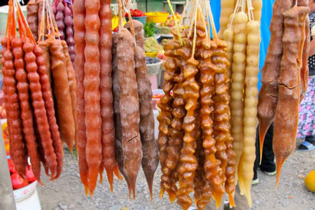 یکی از خوردنی های گرجستان که به عنوان سوغاتی تفلیس می توانید برای دوستان و یا خانواده خود بیاورید. در اصل چورچخلا، از سیب، هلو، آلو یا گردوهایی درست شده که هنگام درست شدن، از رشته های باریکی آویزان و در آب انگور گذاشته می شود و بسیار لذیذ و مقوی است. بسیاری از توریست های تور تفلیس، حداقل یکبار این خوراکی خوشمزه گرجستان را امتحان کرده اند.